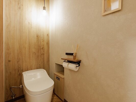 タンクレスで機能が充実している『パナソニック アラウーノ』をご選択。ペーパーホルダー下にはトイレットペーパーを12ロールのまま収納できるスペースを造作しました。収納上部にも小物を置けるスペースを。縁をクロス巻きで施工しているので段差が無くスッキリとしています。